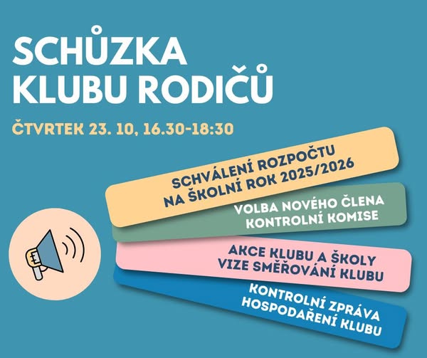Milí rodiče, ve čtvrtek 23. října vás zveme na setkání Klubu rodičů. Společně rozhodneme, jaké školní i vlastní projekty v tomto roce podpoříme.…